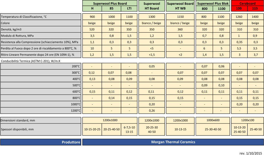 Le Lastre rigide Superwool sono a base di fibre isolanti biosolubili per alte temperature. Non rientrano in nessuna classificazione sulle sostanze cancerogene, secondo la nota Q della direttiva 97/69 EC. Temperatura di Classificazione: 800-900-1000-1100-1150-1300°C  I Ceraboard sono lastre a base di fibre refrattarie e leganti con basso contenuto organico. Temperatura di Classificazione: 1260-1400°C  Possono essere facilmente tagliate per ottenere la forma desiderata.          Superwool 	    Ceraboard  Lastre M.S.P. INSULATION S.r.l. | Via Sandro Pertini, 664 - 21050 Marnate (VA) | tel.: +39 0331 539137 - fax: +39 0331 539851 | p.iva 06817900969 SuperwoolSuperwool Board H85LTIHT BoardHT WB 8001100 100115 Temperatura di Classificazione, °C 90010001100 1300 1150 800110012601400 Colore beigebeigebeigebianco / beigebianco / beigebeigebeigebeigebeige Densità, kg/m3 520320350 350 360 320320310310 Modulo di Rottura, MPa 3,5 0,81,5 1,2 1,5 0,70,8 10,9 Resistenza alla Compressione (schiacciamento 10%), MPa1,1 0,30,3 0,3 0,3 0,30,30,350,3 Perdita al Fuoco dopo 2 ore di riscaldamento a 800°C, %10 5 5 <5 - 6 5 5,53,5 Ritiro Lineare Permanente dopo 24 ore (EN 1094-1), % 1,2 1,51,5 <1,5 <2 1,41,5 33,7 Conducibilità Termica (ASTM C-201), W/m.K         200°C- - - 0,05 - 0,070,06- - 300°C0,120,070,08 - 0,07 0,070,070,070,07 400°C0,130,080,09 0,08 0,09 0,080,080,080,08 500°C- - - - - 0,090,10- - 600°C0,150,110,12 0,11 0,12 0,110,110,110,11 800°C- 0,140,15 0,15 0,15 - -0,150,15 1000°C- - - 0,20 - - -0,200,20 1200°C- - - 0,26 - - - - - Dimensioni standard, mm 1200x10001200x1000 6-7,5-1020-25-30 10-13-20 13-15 40-50 25-40-50 Produttore Superwool Plus BlokCeraboard Superwool Plus Board 1200x1000 1000x600 1200x100 Spessori disponibili, mm 25-40-50 Morgan Thermal Ceramics 10-15-20-2520-25-40-50 10-13-15 25-30-40-50 rev. 1/10/2015